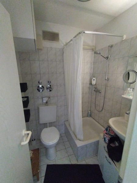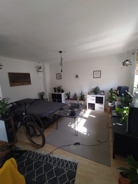 1 großes Zimmer mit 2 Großen Fenstern und Balkontüre + großer Balkon über die gesamte Wohnungslänge mit Gartenhaus (zusätzlicher Stauraum) + mit Türe abgetrennter Küchen und Eingangsbereich + Badezimmer mit Toilette und Dusche + vergittertes Dachbodenabteil