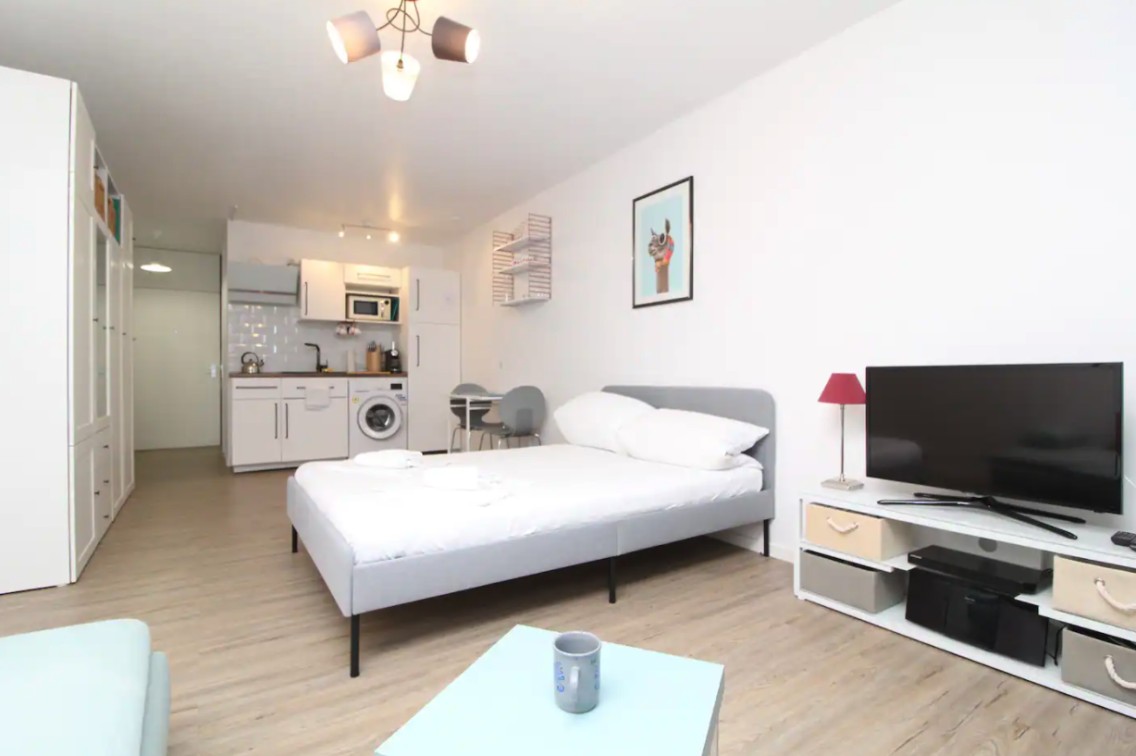Wohnbereich: Vinylboden, Bett (120 x 200cm), Sofa, Schrank, Esstisch, Wandregal, TV, Musik-Anlage