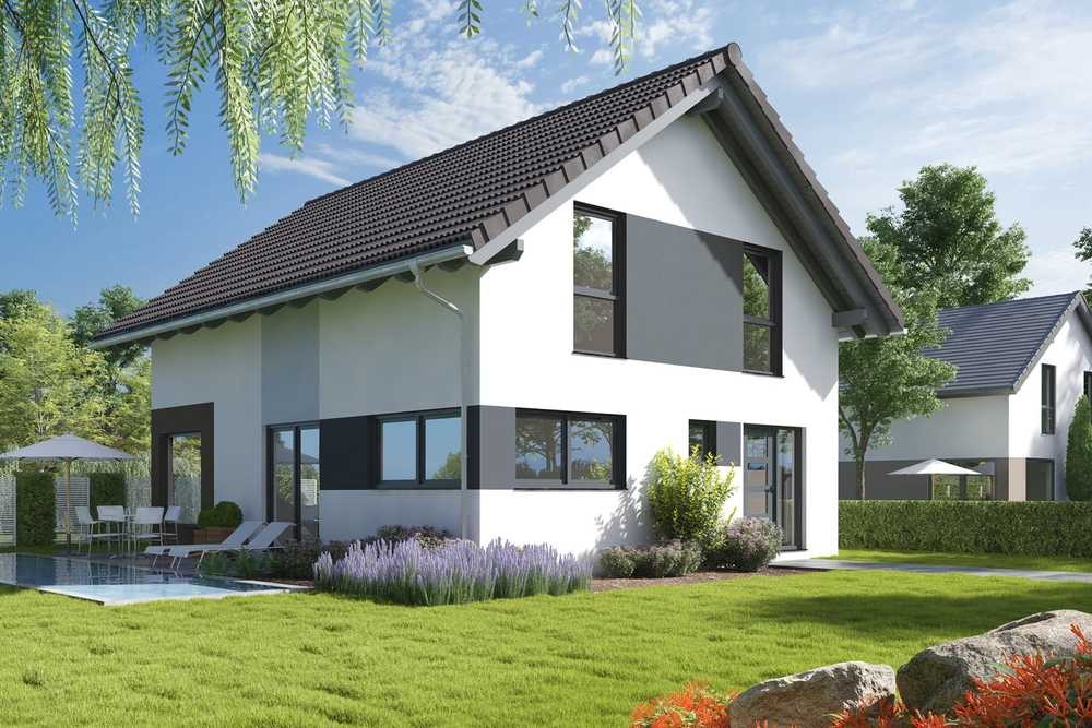 Auf kompakter Grundfläche bietet das Architektenhaus Belloccio offenes, großzügiges Wohnen. Bodentiefe Fenster sorgen im Wohnbereich und auch in den beiden großen Kinderzimmern im Dachgeschoss für viel Helligkeit. Ein besonders angenehmes Extra ist bei diesem individuellen Fertighaus-Konzept die Ankleide im Obergeschoss, die direkt an das Elternschlafzimmer anschließt.