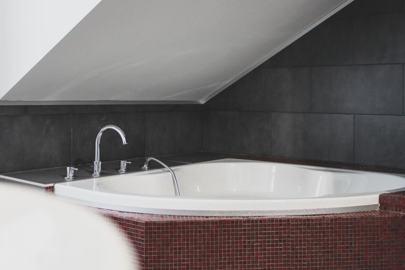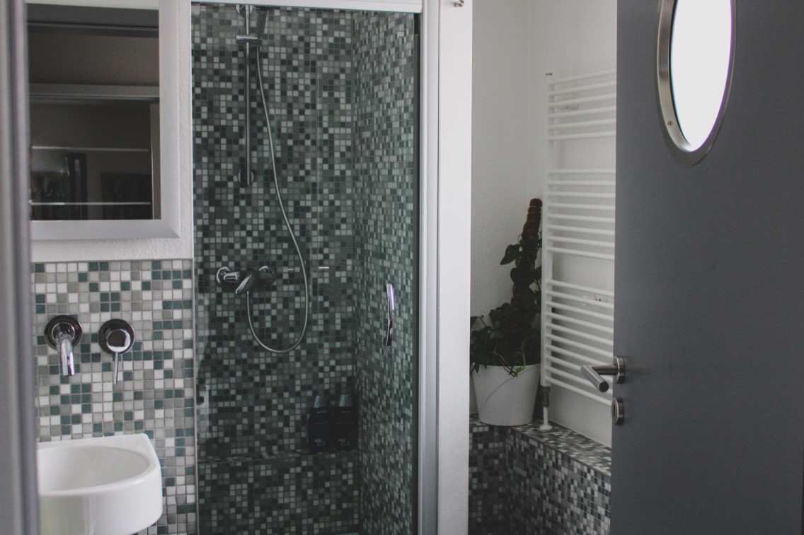 Das helle Badezimmer im Dachgeschoss verfügt neben einer Dusche und einem WC zusätzlich über eine große Badewanne für sinnliche Abende.