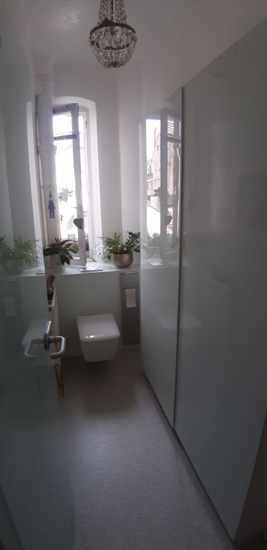 Die Toilette befindet sich separat, ebenfalls mit Fenster und einem in einem angepassten Glasvorbau versteckten Spülkasten.