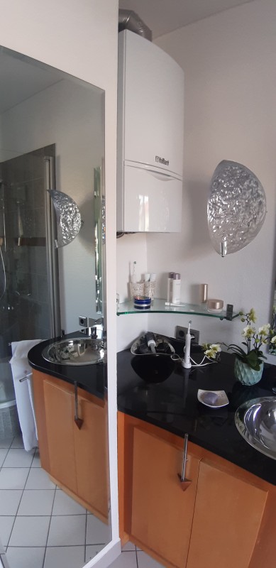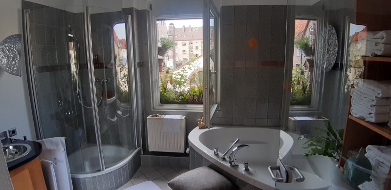 Im Tageslichtbad finden sich ebenfalls maßgefertigte Möbel. Der mit schwarzem Granit belegte Waschtisch ist mit Dornbracht-Armaturen ausgestattet. Neben der Eckbadewanne findet sich noch eine mit Glastüren abgetrennte Dusche. Die weiße Spanndecke komplettiert die hochwertige Ausstattung.