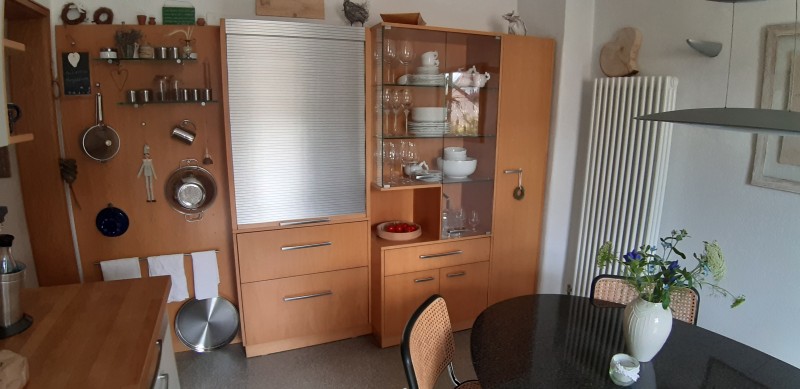 Die Wohnküche zeichnet sich durch einen Miele Küchenblock mit Echtholzarbeitsplatte und von einem Schreiner maßgefertigte Küchenmöbel aus.