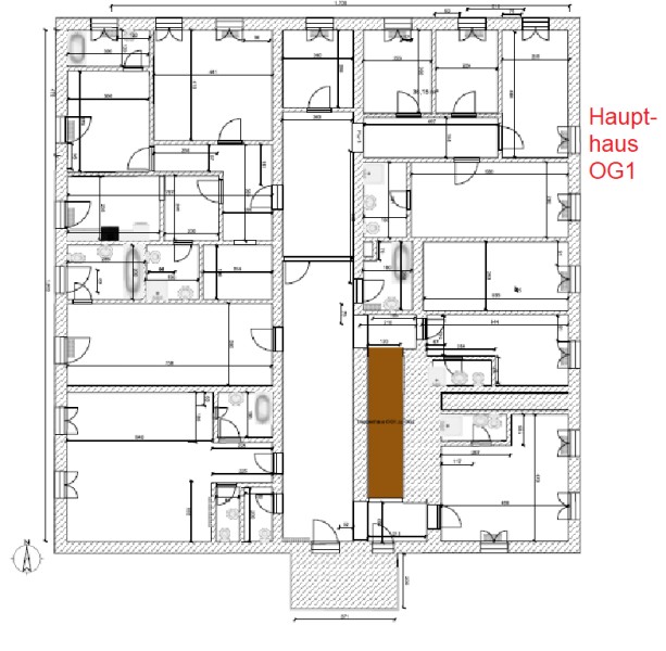 Je Haus EG, OG1 und 2 OG so wie DG bei einem ohne Ausbau, beim anderen Teilausbau. Es sind 33 Zimmern, 23 Bäder.