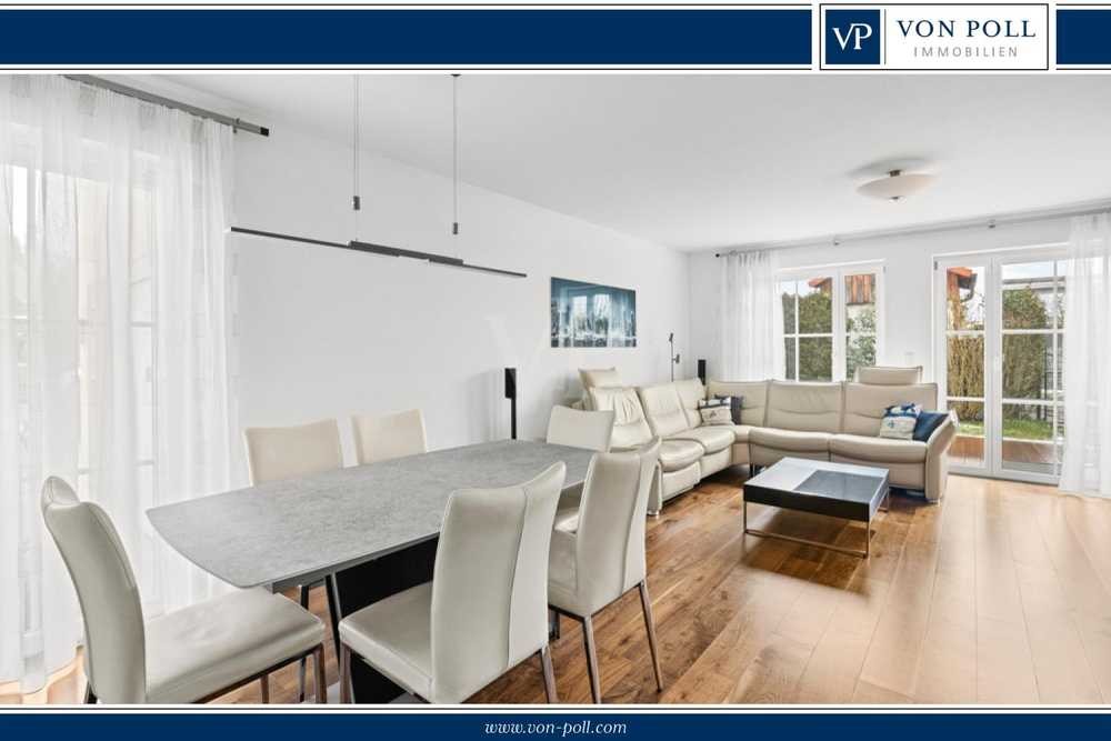 Im Mittelpunkt steht der lichtdurchflutete, offene Wohn- und Essbereich mit bodentiefen Fenstern und direktem Zugang zur sonnigen Terrasse samt gepflegtem Garten – ein perfekter Ort zum Entspannen an warmen Tagen.