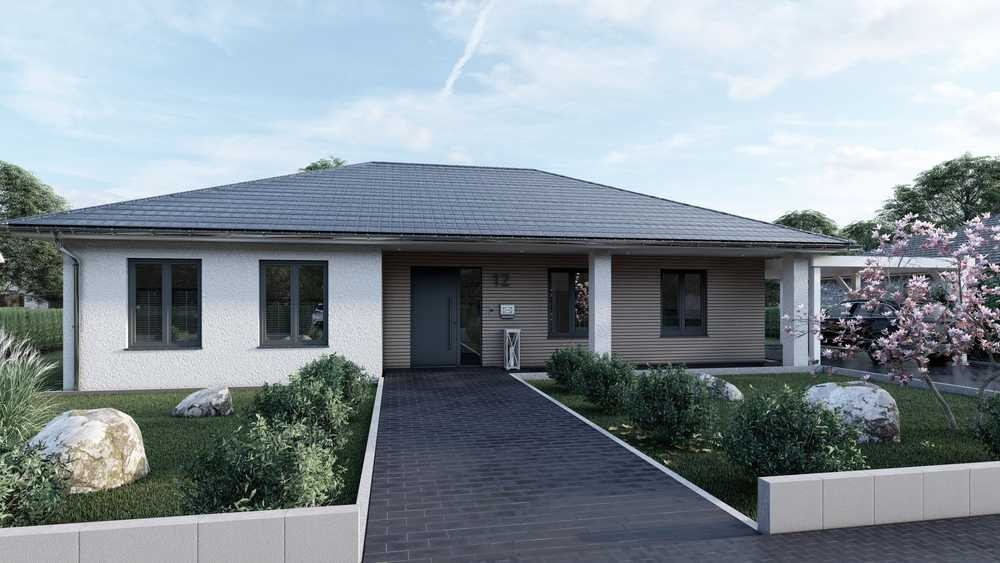 Der Bungalow wird massiv "Stein auf Stein" errichtet. Die Fassade wird mit einem Strukturputz realisiert. Die Fenster sind dreifachverglast, außen Anthrazit und mit Sicherheitsklasse RC1N versehen. Außerdem verfügt jedes Fenster über einen elektrischen Rollladen aus Aluminium in Fensterfarbe. Die Badausstattung erfolgt mit einem formgeschlossenen spühlrandlosen WC. Die Walk-in-Dusche ist ebenerdig gefliest und verfügt über ein Duschsystem mit Regenkopf. Die Badewanne ist eine 180cm Duo Wanne. Zu der regulären E-Ausstattung sind 6 Netzwerkdosen, sowie je Zimmer eine TV-Dose verbaut. Beheizt wird das Haus mit einer Fußbodenheizung im Zusammenspiel mit einer Vaillant Luft-Wärmepumpe.