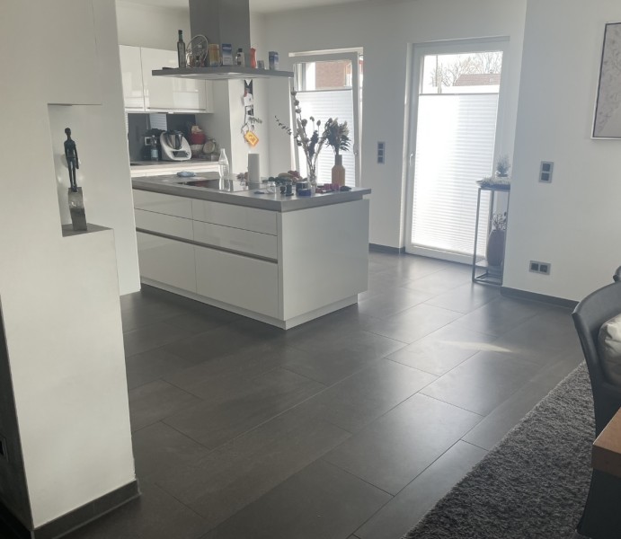 Großer Flur, Gäste-Wc, Büro, HWR mit Zugang zur Garage und offene Wohnküche mit Kamin und Zugang zur Terrasse & Garten.