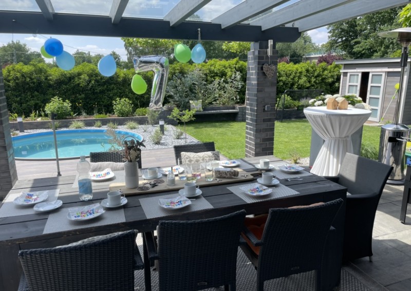 Schöner Garten mit Pool, Glasüberdachung und Markise