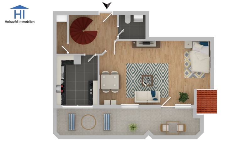 In der unteren Ebene der Wohnung befindet sich das schön ausgestattete Gäste-WC, die Küche, ein Abstellraum sowie das bereits erwähnte große Wohnzimmer. Von diesem aus gelangt man auf den 17m² großen Südbalkon.