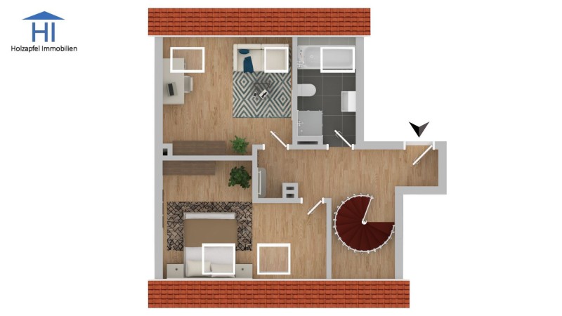 Die Wendeltreppe in der Diele führt zu zwei schönen und hellen Schlafzimmern, sowie einem hochwertigen Badezimmer mit Wanne, Dusche und Fenster.