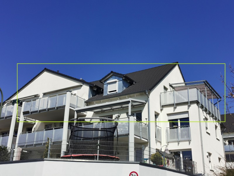 + elektrische Markise (Südbalkon), textiler Sonnenschutz unter Glasdach (Ost-Dachterrasse)