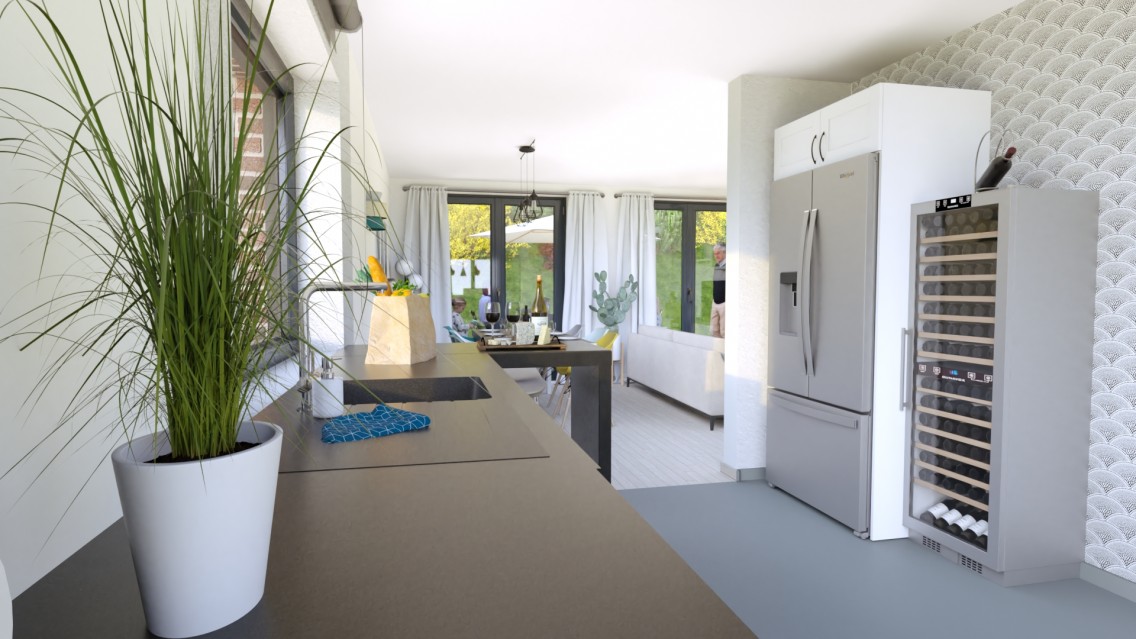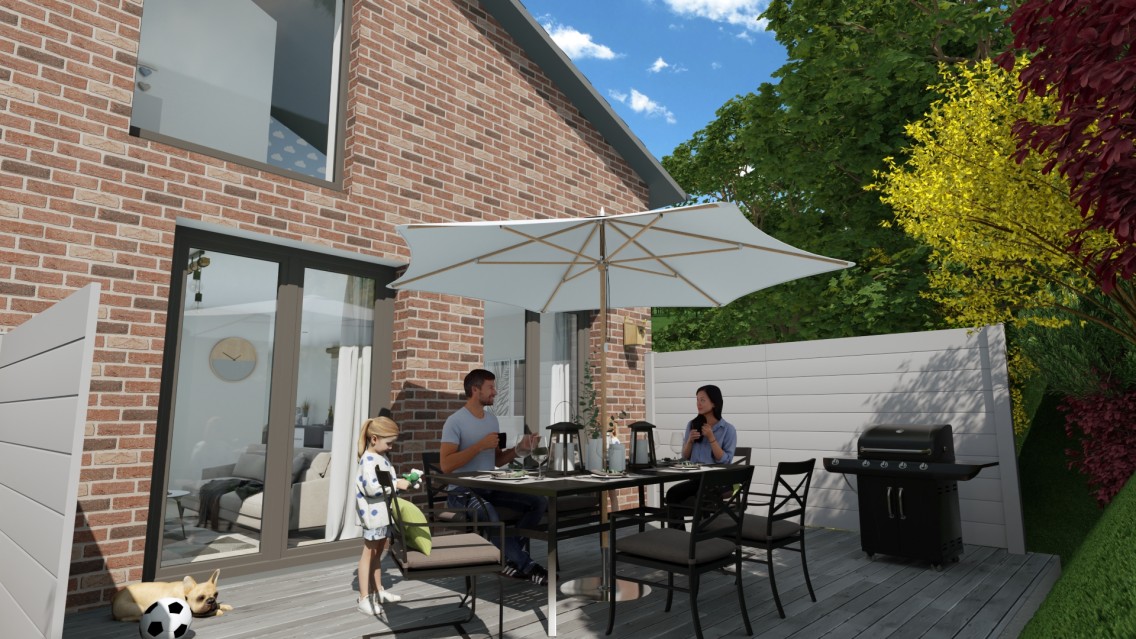 - eine große Terrasse hinterm Haus erweitert bis auf die Garage