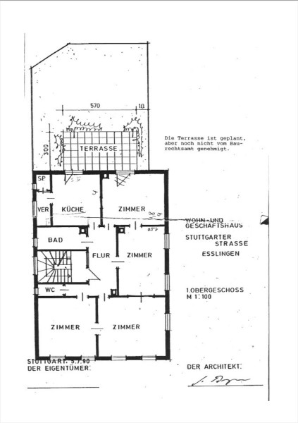 Außerdem gibt es Pläne für eine große Terrasse, die direkt von Küche und einem der Zimmer begehbar wäre, die bereits baurechtlich genehmigt aber nicht gebaut wurde.