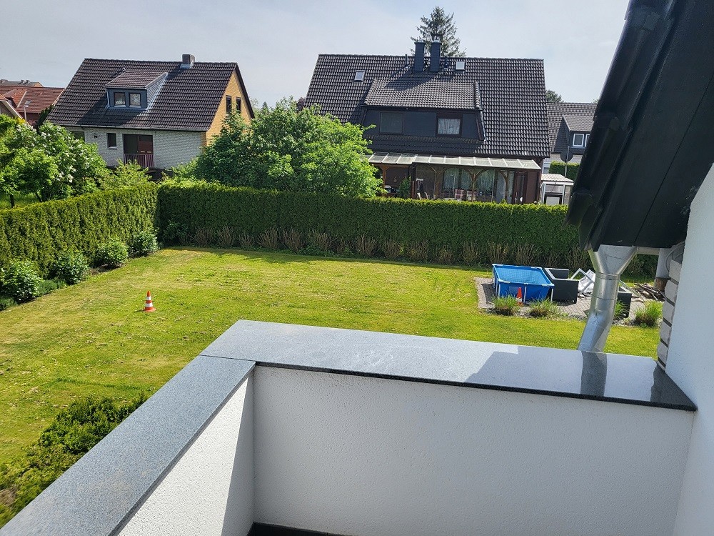 Über das Obergeschoss erreichen Sie den Balkon, welcher sich auf der Rückseite des Gebäudes befindet (Ostseite).