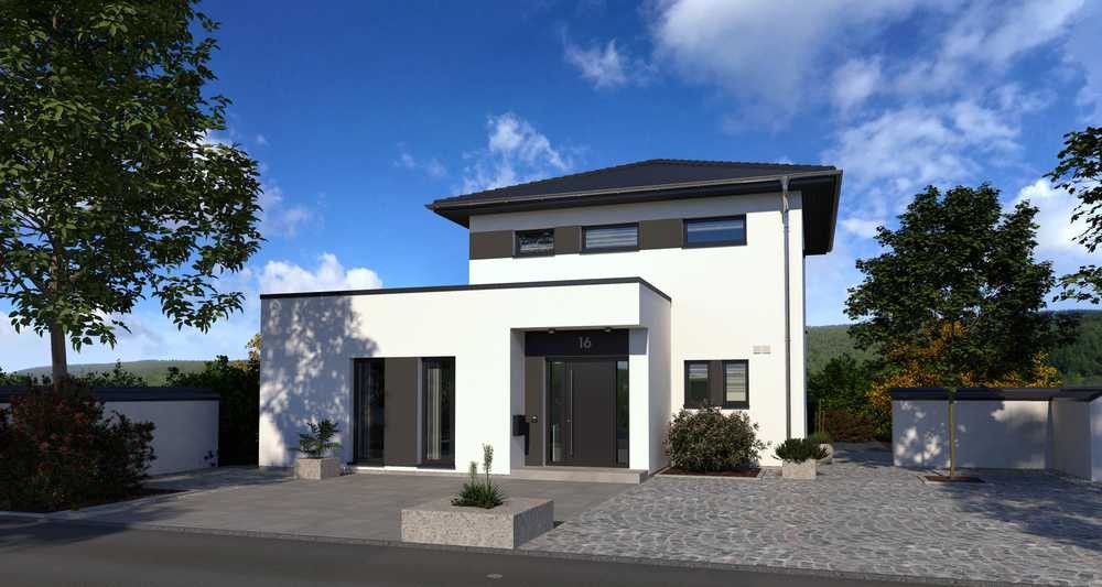 Die quadratische Walmdachvilla wird mit einem Eckanbau optisch und räumlich ergänzt. Der geschützte Eingangsbereich mit Windfang führt in die Diele. Von hier geht es in den offenen Wohn- und Essbereich mit halboffener Küche, von der ein direkter Zugang zum Außenbereich möglich ist. Außerdem befinden sich der ausgelagerte Elternbereich mit Ankleide und eigenem Duschbad sowie Hauswirtschaftsraum und Gäste-WC im Erdgeschoss. Die halbgewendelte Treppe führt in die obere Etage, wo sich eine kleine Galerie befindet. Hier haben die Kinder ihr eigenes Reich. Zwei identisch gespiegelte Zimmer sowie das geräumige Badezimmer sorgen dafür, dass der Nachwuchs sich ungestört entfalten kann.