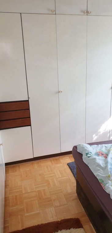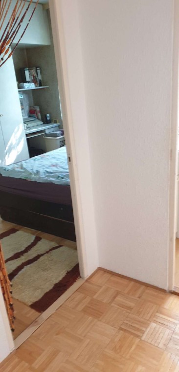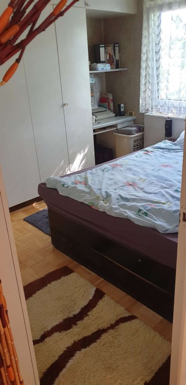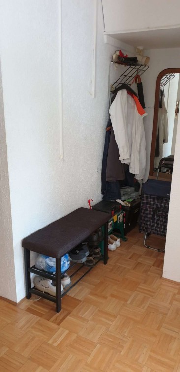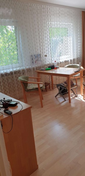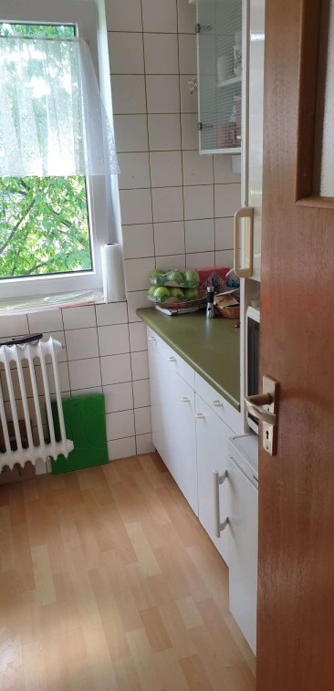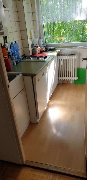 Der Boden im Flur und Schlafzimmer ist mit Riemchenparkett ausgestattet, Küche und das Wohnzimmer haben Laminatboden .