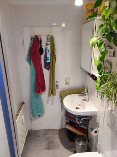 Das Badezimmer mit Dusche, WC, Handwachbecken, Waschmaschinenanschluss und Fenster lässt keine Wünsche offen.