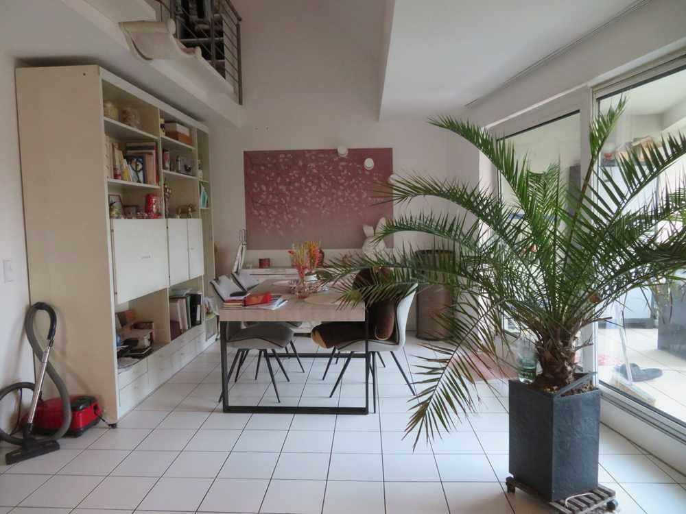 Die Maisonette-Wohnung in der 2. Etage beherbergt in der unteren Etage ein schönes sehr geräumiges Wohnzimmer mit großen bodentiefen Fenstern, das zum Teil gemütlich durch Schrägen gestaltet ist und im Ausblick auf die große Terrasse viel Lichteinfall hat. Durch die Öffnung und den Blick zur Empore hin, verfügt der Raum über viel Höhe und eine große Ausstrahlung.