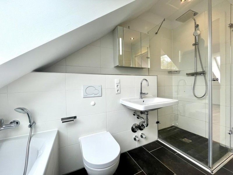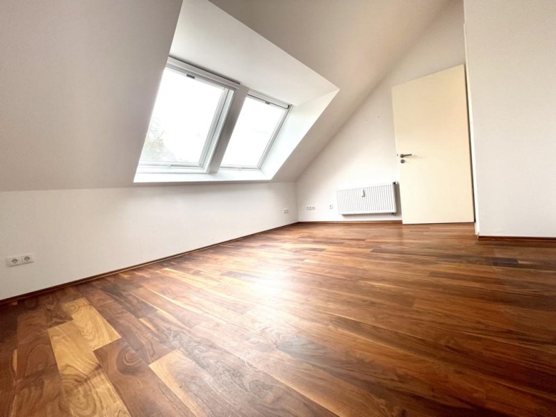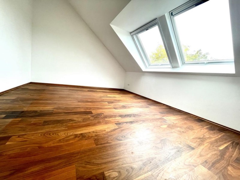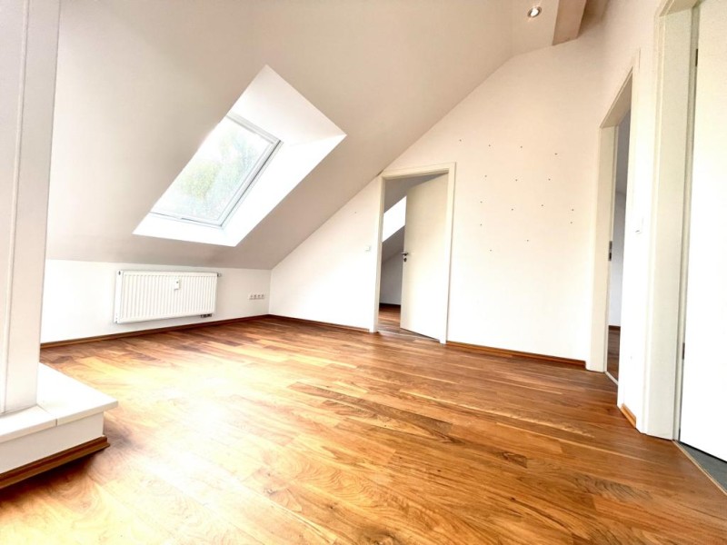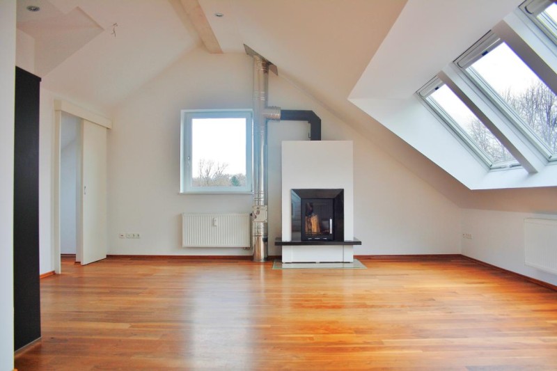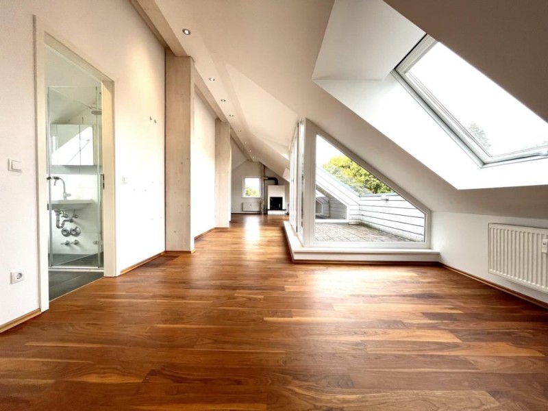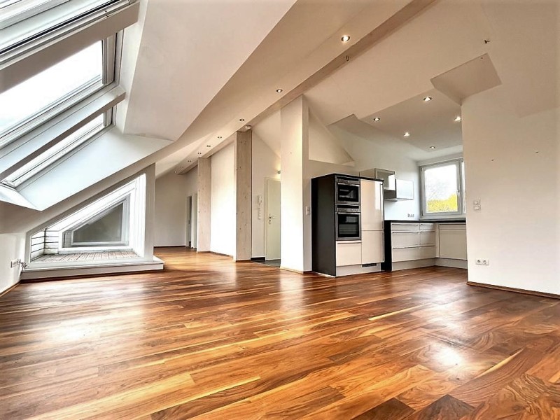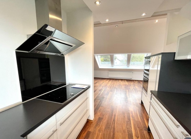 Helle Räume, großzügige Architektur, Nussbaumparkett bzw. elegante, graue Fliesen, weiße Türen, moderne Bäder, Süd-Balkonterrasse, hochwertige Einbauküche, gemütlicher Kamin, bis zu ca. 3,5 Meter hohe Deckenhöhen und... Ruhe! 2009 wurde das Haus mit dieser einen Dachgeschosswohnung aufgestockt, indem man einen komplett neuen Dachstuhl, etc. baute. Der Eingangsbereich besteht aus einer praktischen Garderobe. Zudem befindet sich hier das Gäste-WC samt Waschmaschinenanschluss. Herzstück ist der 55m² große Koch-, Wohn,- Essbereich mit einer hochwertigen, modernen Küche samt Induktionsherd und Dampfgarer. Neben der Küche befindet sich eine praktische Speisekammer mit Schiebetür. Der gesamte Raum verfügt über vier Dachflächenfenster (mit Sonnenschutz) sowie zwei weitere große Fenster. Zudem ist die 7,4m² große Balkon-Terrasse, die nach Süden ausgerichtet ist, komplett verglast. Der Kamin, indem man die Holzscheite brennen sieht, sorgt gerade in in der kühleren Jahreszeit für angenehme Wärme und eine gemütliche Atmosphäre. Ein Platz zum Arbeiten findet man in einer gemütlichen Nische zwischen Terrasse und Gäste-/Kinderzimmer. Das Schlafzimmer ist Richtung Norden ausgerichtet und bietet genügend Platz für einen großen Kleiderschrank. Über dem Bett befinden sich zwei Dachflächenfenster durch die man nachts in die Sterne gucken kann. Durch die gute Isolierung sowie die Möglichkeit über die Dachfenster quer zu lüften, ist die Wohnung auch im Sommer gut zu bewohnen.