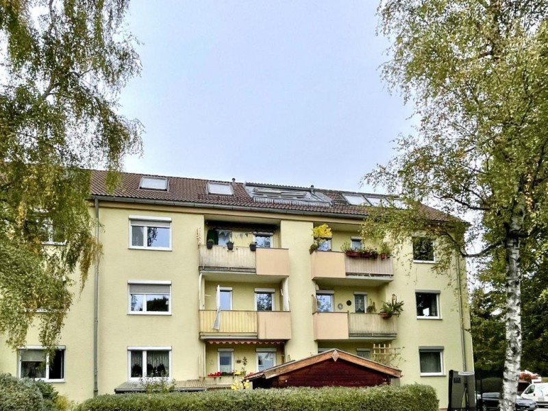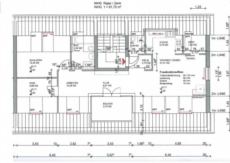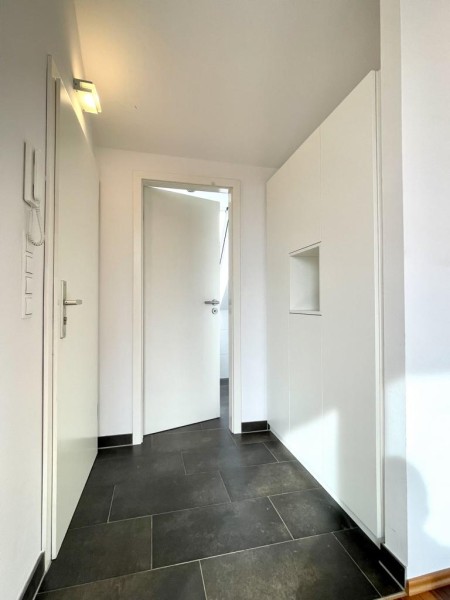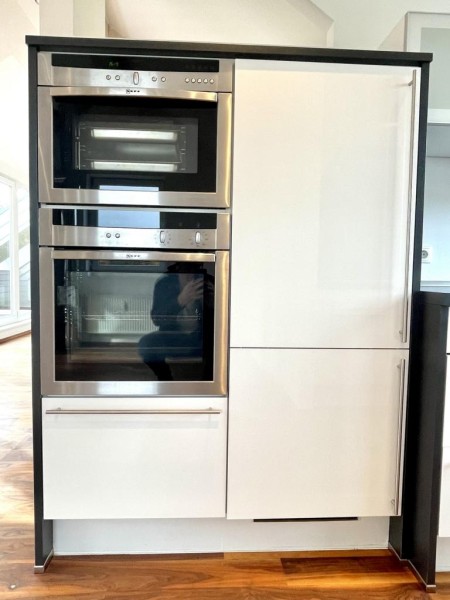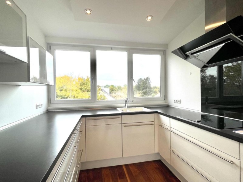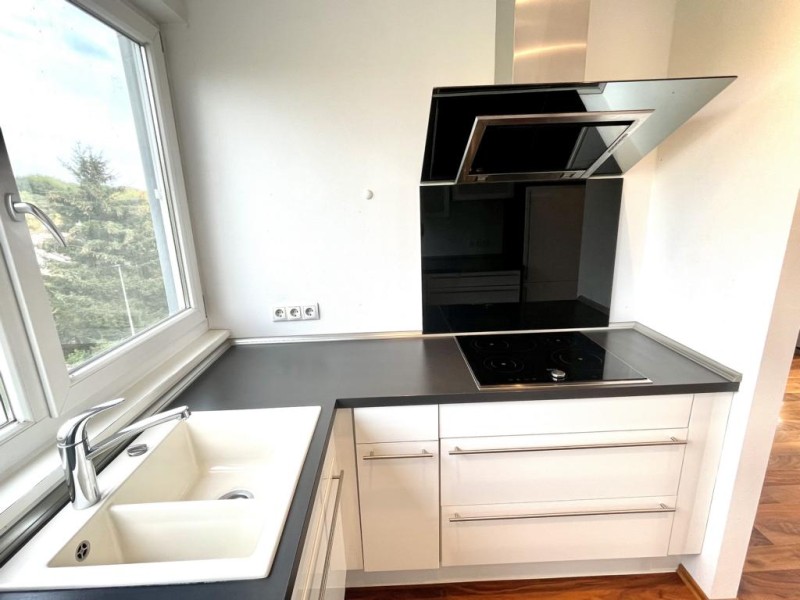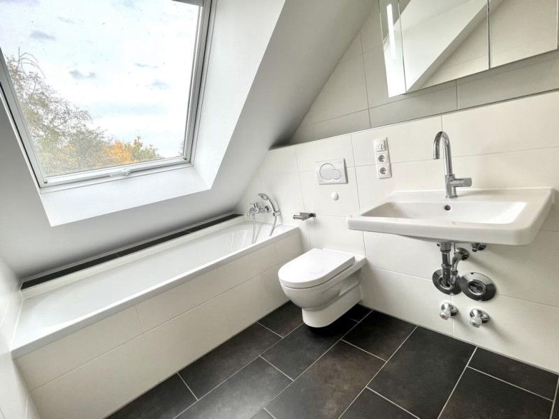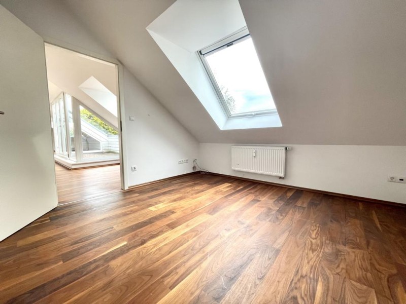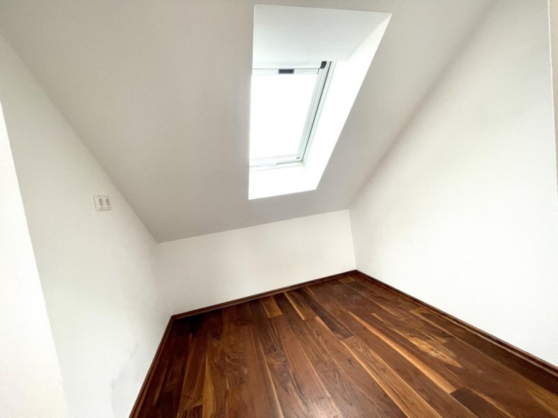 Helle Räume, großzügige Architektur, Nussbaumparkett bzw. elegante, graue Fliesen, weiße Türen, moderne Bäder, Süd-Balkonterrasse, hochwertige Einbauküche, gemütlicher Kamin, bis zu ca. 3,5 Meter hohe Deckenhöhen und... Ruhe! 2009 wurde das Haus mit dieser einen Dachgeschosswohnung aufgestockt, indem man einen komplett neuen Dachstuhl, etc. baute. Der Eingangsbereich besteht aus einer praktischen Garderobe. Zudem befindet sich hier das Gäste-WC samt Waschmaschinenanschluss. Herzstück ist der 55m² große Koch-, Wohn,- Essbereich mit einer hochwertigen, modernen Küche samt Induktionsherd und Dampfgarer. Neben der Küche befindet sich eine praktische Speisekammer mit Schiebetür. Der gesamte Raum verfügt über vier Dachflächenfenster (mit Sonnenschutz) sowie zwei weitere große Fenster. Zudem ist die 7,4m² große Balkon-Terrasse, die nach Süden ausgerichtet ist, komplett verglast. Der Kamin, indem man die Holzscheite brennen sieht, sorgt gerade in in der kühleren Jahreszeit für angenehme Wärme und eine gemütliche Atmosphäre. Ein Platz zum Arbeiten findet man in einer gemütlichen Nische zwischen Terrasse und Gäste-/Kinderzimmer. Das Schlafzimmer ist Richtung Norden ausgerichtet und bietet genügend Platz für einen großen Kleiderschrank. Über dem Bett befinden sich zwei Dachflächenfenster durch die man nachts in die Sterne gucken kann. Durch die gute Isolierung sowie die Möglichkeit über die Dachfenster quer zu lüften, ist die Wohnung auch im Sommer gut zu bewohnen.