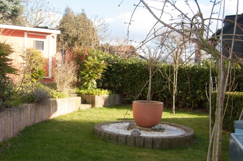 Der im Garten installierte Regenwassertank versorgt frischwassersparend die WC-Spülung und Gartenbewässerung.