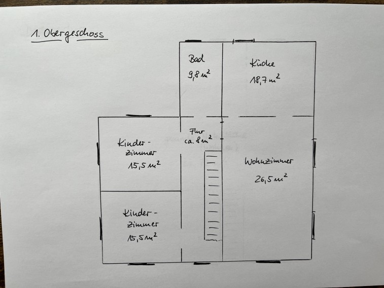 Im 1. Obergeschoss ist ein grundsanierter Wohnbereich mit Wohnzimmer (mit Kaminanschluss), Küche, 2 Kinderzimmern, Flur (mit Kaminanschluss) und Bad zu finden.