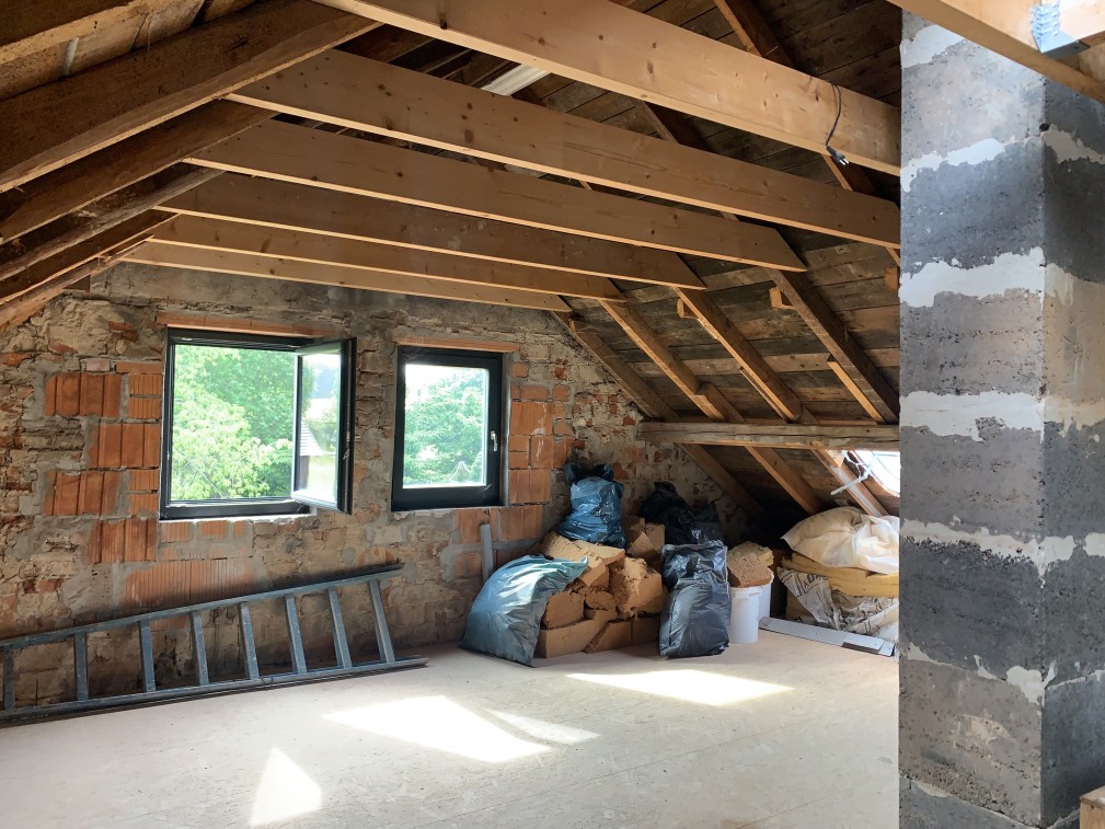 Das Dachgeschoss mit ca. 75 m² Wohnfläche ist entkernt und teilweise gedämmt und bietet Raum für eine individuelle Gestaltung.