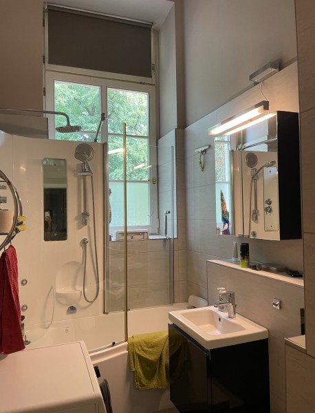 Die Wohnung verfügt des Weiteren über ein Schlafzimmer, ebenfalls mit hohen Decken, sowie im Untergeschoss über einen ca. 22 m² großen Raum, der mit seinen Tageslichtfenstern auch als weiterer Wohnraum genutzt werden kann. Ein modernes Tageslichtbad mit Whirlpoolbadewanne und Waschmaschinenanschluss gehört ebenfalls zur Ausstattung.