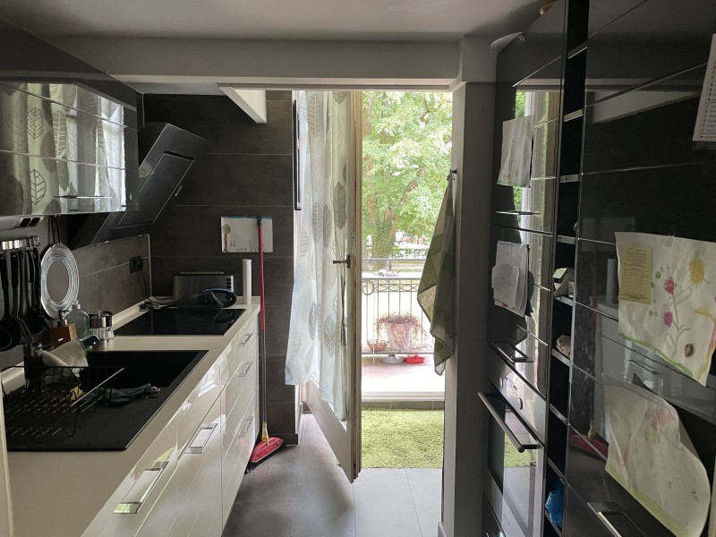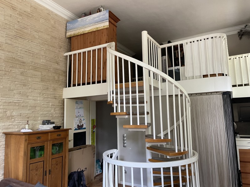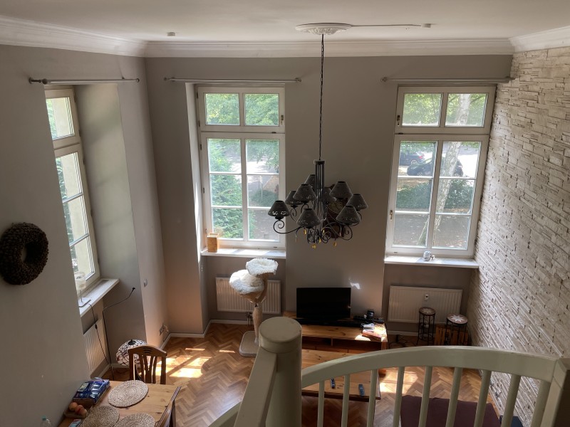 Über einen großzügigen, hellen Hauseingang gelangt man in den Flur der Wohnung. Von dort geht es direkt in den Wohn- und Essbereich, der mit seinen ca. 5 Meter hohen Decken das Herzstück der Wohnung bildet. Eine moderne, nachträglich gebaute Wendeltreppe führt zur Galerie, von der aus man einen schönen Ausblick in das Wohnzimmer und durch die Fenster in den Park hat. Eine offene Küche mit Zugang zum Balkon sowie die moderne Ausstattung tragen zu einer schönen Atmosphäre bei.