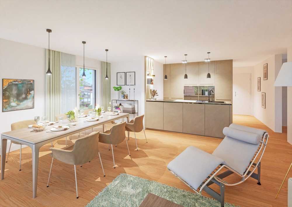 Die Südausrichtung der drei Baukörper und die Integration des Dreier-Ensembles in den Geländeverlauf unterstreichen die Qualität der Planung. Die Symbiose aus Naturnähe und urbanen Lebensgefühl kann kaum besser dargestellt werden.