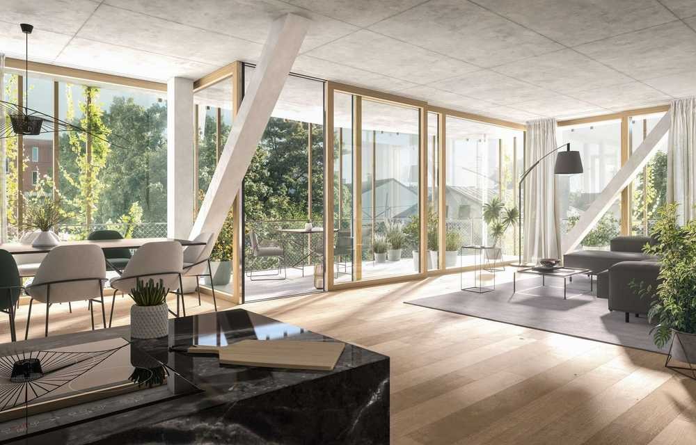 Das von der Natur inspirierte Konzept spiegelt sich sowohl in der Wahl der Materialien als auch in der Innenarchitektur wider. Alle Fenster bestehen aus warmem Holz. Kombiniert mit einem angenehmen Holzboden sowie betonsichtigen Decken, die für eine klare, ruhige und zeitlose Atmosphäre sorgen. Auch die Bäder folgen der ganzheitlichen Leichtigkeit und beflügeln die Entspannung mit schwebend montierten Elementen. Der exzellente Schallschutz nach außen wie innerhalb des Hauses lässt jede Wohnung zum eigenen Ruhepol werden. Für das Sicherheitsgefühl sorgen ein exklusiver Zugang sowie einbruchshemmende Türen.