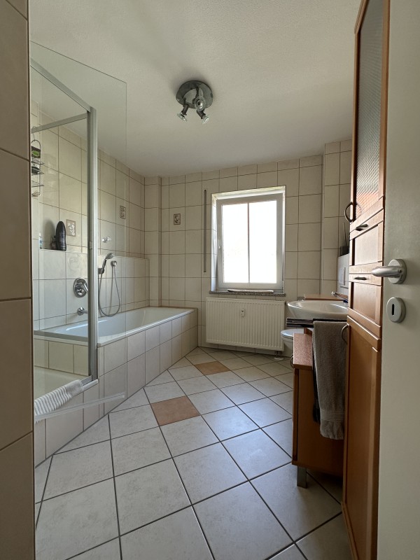 Kellerabteil, TG-Stellpatz, Abstellkammer, hochwertige Fliesen in Diele und Küche, heller Laminatboden in den übrigen Räumen, bodentiefe Fenster außer in Küche und Bad. Badausstattung: hochwertige Armaturen, Kermi-Duschkabine. Weiße Türen und Zargen. Markengeräte in der Küche mit Geschirrspüler, Backofen mit Ceran-Kochfeld, Dunstesse mit Außenabzug, Kühlschrank etc.