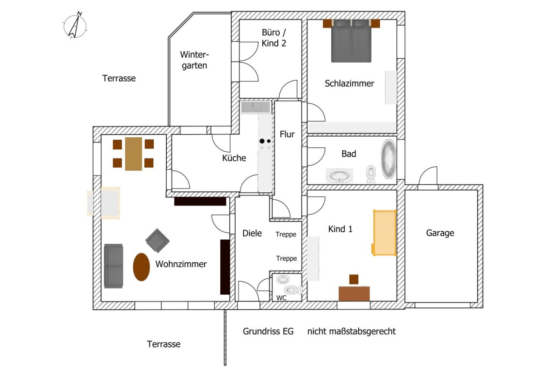 Das Haus hat eine Gesamtwohnfläche von 163 m² , wovon 112 auf das Erdgeschoss entfallen, zusätzlich ist es komplett unterkellert. Eine Garage mit einer langen Einfahrt gehören ebenso zu der Ausstattung wie zwei Terrassen und ein Wintergarten. Ein Kachelofen mit Kamineinsatz sorgt im Winter für angenehme Wärme und geringe Energiekosten.