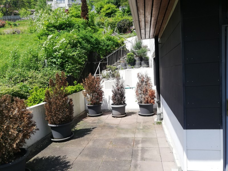 Die großzügige Terrasse mit 55m² in sonniger Südlage, bietet einen schönen Blick auf die Natur. Diese lädt ein zum gärtnern, spielen, grillen, oder einfach nur Entspannen.