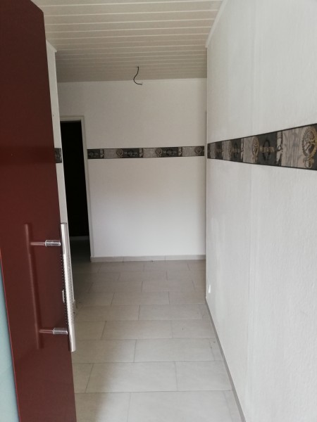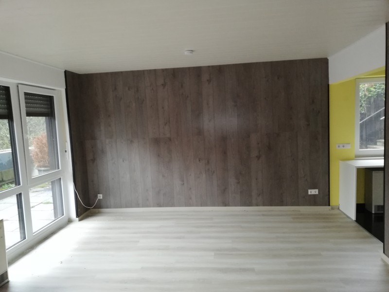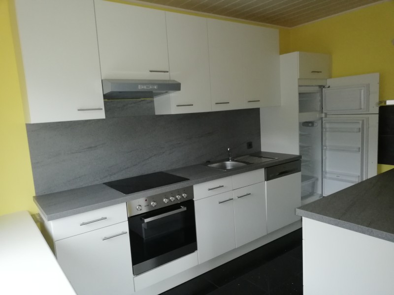 Einbauküche, Fliesenbelag, Laminatböden, Terrasse mit Waschbetonplatten, Fenster aus Kunststoff mit Dreifachverglasung.