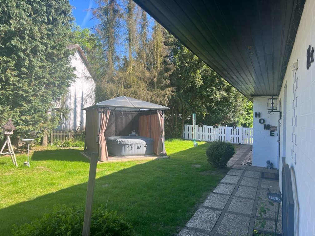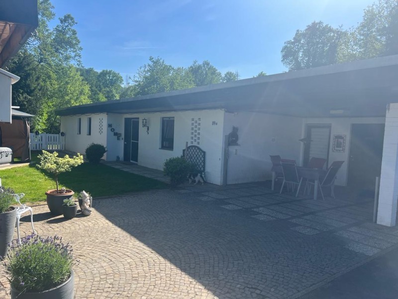 Dieser wunderschöne Bungalow liegt ca 50m von der Straße entfernt. Dadurch bekommt man vom Leben, auf Dieser, auch nichts mit. Leider ist die Zufahrt etwas holprig! Also nicht abschrecken lassen!!! Denn: man geht vorne rein und ist hinten im Niemansland! Das hintere Grundstück ist umpflanst mit Rododendren, Buxbäumen, Tujas und vieles mehr. Völlig uneinsehbar. Angrenzend fließt der kleine Bach, Sülz. Das vordere Grundstück umfasst ein Gartenhäuschen, mit Holz Lager für den offenen Kamin und Stauraum für Gartengeräte. Desweiteren haben wir eine kleine Terrasse, in mitten der vorderen Wiese gebaut, die von einem festen Pavillon ummantelt ist und einen Wirlpool, beherbergt. Dieses Haus bietet auch sehr viel Stauraum im Inneren, durch Einbau Schränke, Abstellraum, und zwei Nebenräume. Einen davon nutzen wir als Waschraum.