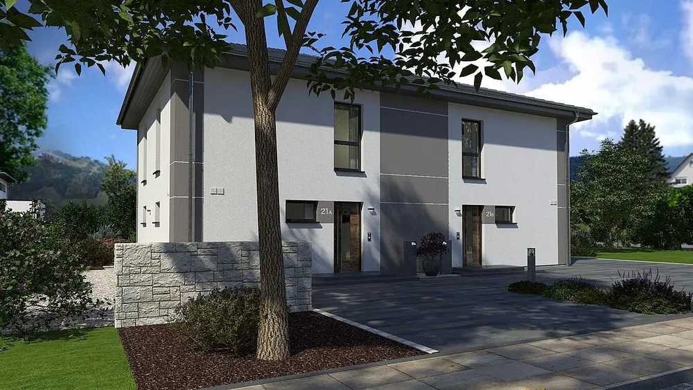 Durch seine Größe, das elegante Walmdach und die großen Fensterfronten wirkt unser Doppelhaus 11 herrschaftlich und imposant. Erst auf den zweiten Blick ist erkennbar, dass es sich um zwei getrennte Wohneinheiten handelt, in denen den künftigen Hausherren jeweils rund 142 m² Wohnraum zur Verfügung stehen. Im Erdgeschoss bietet das große Wohn-Ess-Zimmer mit sich direkt anschließender Küche ausreichend Raum für gemütliche TV-Abende, aber auch, um Gäste zu empfangen. Von hier aus ist auch der Zugang zur Terrasse bzw. zum Garten möglich. Große Fensterfronten sorgen für ausreichend Lichteinfall. Abgerundet wird das Raumangebot im Erdgeschoss durch einen Hauswirtschaftsraum, Gäste-WC und eine große Diele mit Garderobe. Von hier aus führt der Weg ins Obergeschoss, wo insgesamt drei Schlafräume zur Verfügung stehen. Ein Bereich für die Eltern sowie zwei Kinderzimmer. Highlight ist das mehr als 13 m² große Badezimmer, das mit Wanne, Dusche und WC einer Wohlfühloase gleicht.
