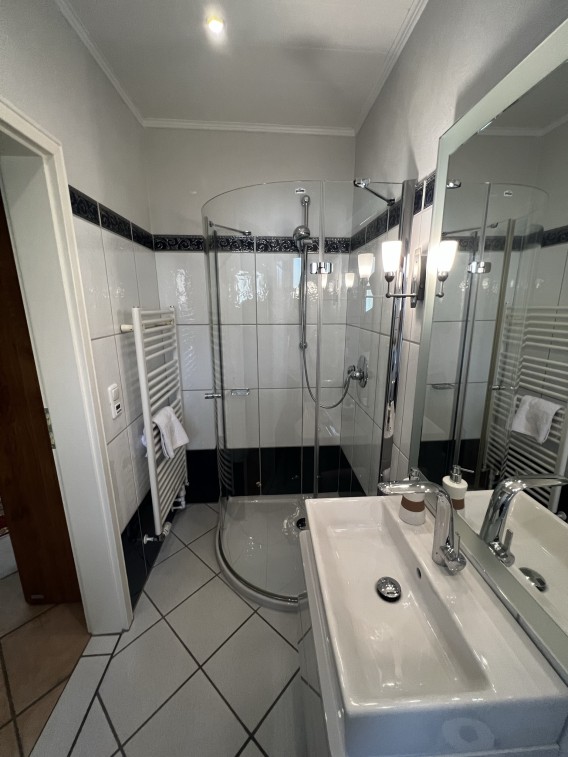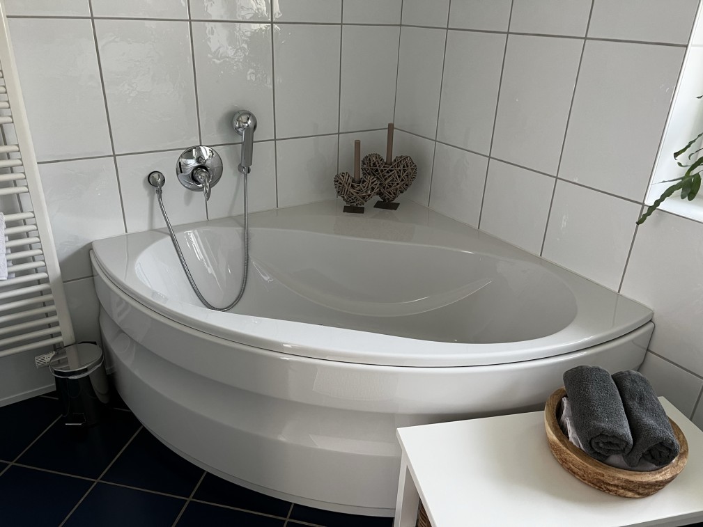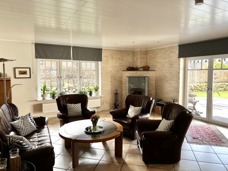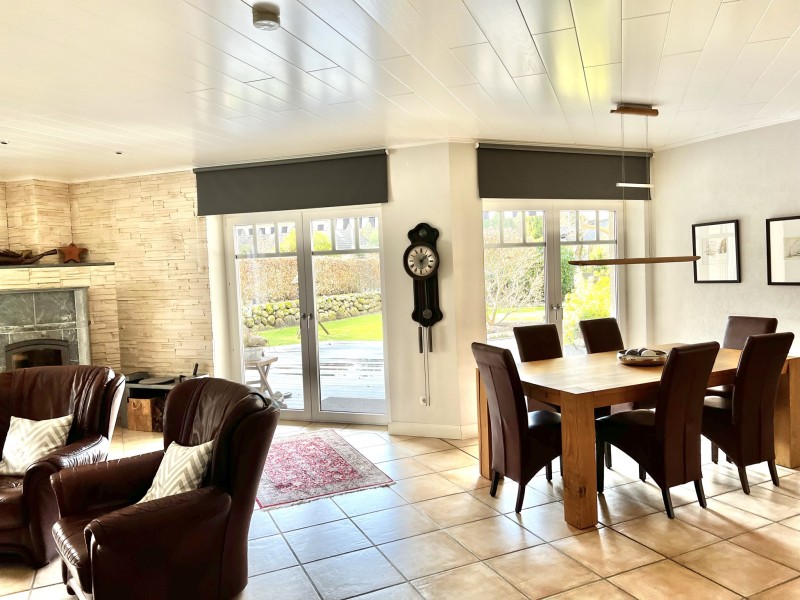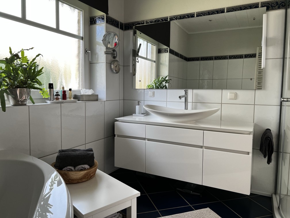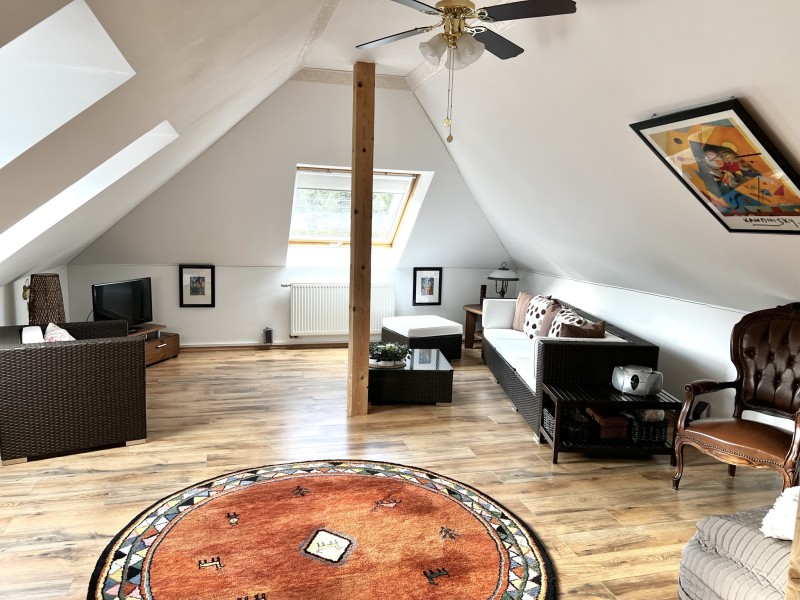Durch die Doppelflügeltür im Flur, gelangt man in das 49 QM große Wohnzimmer mit Kamin und traumhaften Ausblick in den Garten. Des weiteren befinden sich im Erdgeschoss 3 schön geschnittene Zimmer, wobei an das Hauptschlafzimmer ein geräumiges Badezimmer mit Dusche, Eckbadewanne und Doppelwaschtisch, angrenzt.