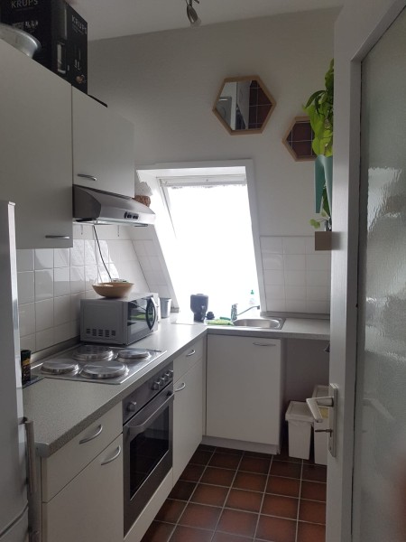 Das Badezimmer ist mit einer Badewanne ausgestattet. Die Einbauküche ist modern und bietet genügend Platz zum Kochen.