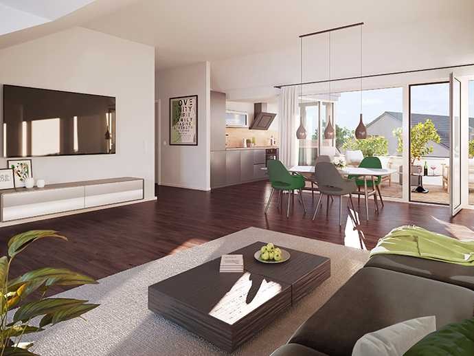 Das Zentrum der Wohnung bildet der große offene Wohnbereich mit bis zu 3 m Raumhöhe. Die nach Westen ausgerichtete, uneinsehbare Dachterrasse von ca. 11 m² Nutzfläche betreten Sie bequem über eine komfortable Schiebetüre. Nach Osten vergrößert eine Gaube die Sofasitzecke und sorgt für zusätzliches Tageslicht. Geschickt flankiert die Küche die komplett verglaste Dachterrasse.