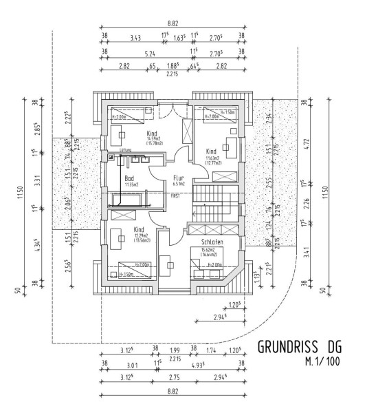 Obergeschoss:Im Obergeschoss befinden sich vier ebenfalls zugeschnittene Schlafzimmer von ca. 65,26m².Hinzu kommt ein Badezimmer von 11,35 m² mit doppeltem Waschbecken, Dusche, WC und freistehendem Badewanne.