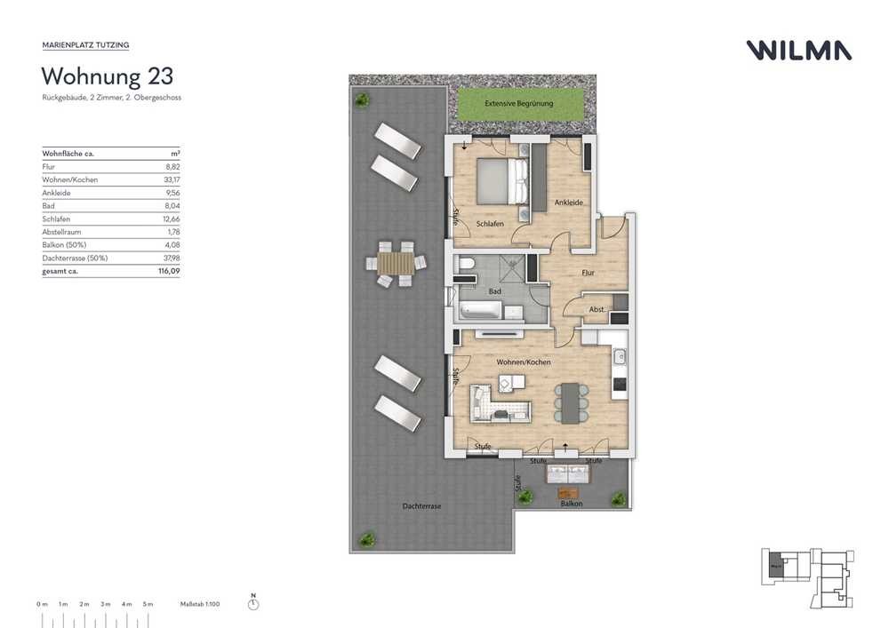Das Highlight ist die knapp 44 m² große Südwest-Dachterrasse sowie der zusätzliche Südbalkon.