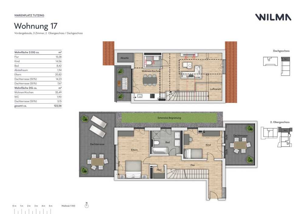 Diese 3-Zimmer-Wohnung befindet sich im zweiten Obergeschoss sowie im Dachgeschoss des Vordergebäudes und hält einige Highlights für Sie bereit. Auf der ersten Ebene bietet diese Wohnung zwei Schlafzimmer sowie ein Badezimmer und eine Abstellkammer. Highlights sind hier die beiden Dachterrassen, welche jeweils einmal über das ca. 15 m² Kinderzimmer im Osten sowie einmal über das ca. 21 m² große Elternschlafzimmer im Westen betreten werden. Hier können Sie sowohl die Morgen- als auch die Abendsonne genießen.