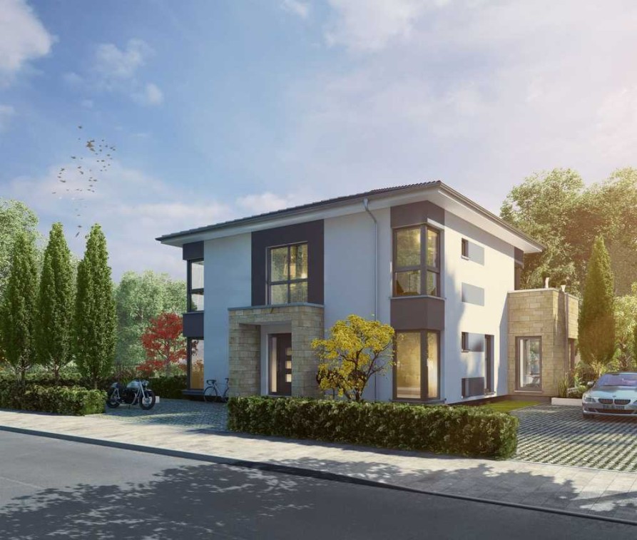 Die Stadtvilla mit Walmdach erstrahlt in nobler Eleganz. Die Grau- und Sandsteinelemente fügen sich harmonisch ins Gesamtbild ein. Was man auf den ersten Blick nur erahnen kann: hier hat Platz Vorfahrt! Schon beim Betreten spürt man die positive Atmosphäre offener Raumgestaltung. Der große Koch- und Wohnbereich wird durch den quadratischen Eck-Anbau optimal ergänzt. Im Obergeschoss liegt die Galerie zwischen dem Elternbereich mit Schlafraum, Balkonzugang und großem Bad und dem Terrain der Kinder.