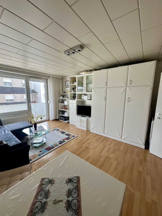 Die Wohnung ist wie folgt aufgeteilt: Ein Flur mit Schrank, einer Abstellkammer, einem Duschbad/WC mit Fenster, einem Wohn-/Schlafzimmer mit ausklappbarem Schrankbett sowie einem Küchenbereich mit Essplatz und einem Balkon. Die Heizung erfolgt über eine eigene Gas-Therme im Bad. Die Fenster sind aus weißem Kunststoff mit zweifacher Isolierverglasung und Außenjalousinen. Der Fußboden besteht aus Fliesen im Bad und Flur, Laminat im übrigen Bereich.