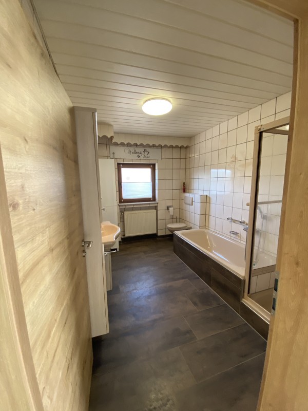 Im Erdgeschoss gelangt man von der Diele über eine Treppe in die obere Etage. Hier befindet sich die moderne Küche / Esszimmer mit direktem Zugang auf die Terrasse. Die Räumlichkeiten bei der Küche bieten genügend Platz, um mit der Familie gemütliche Stunden am Frühstückstisch zu verbringen. Verlässt man diesen Bereich gelangt man in das Wohnzimmer, welches ebenfalls eine gemütliche Atmosphäre bietet. Ebenfalls befinden sich auf der oberen Etage ein Badezimmer mit Badewanne / Dusche.
