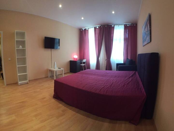 Sehr geräumige und gut renovierte 1 Z-Wohnung mit großem Wohnzimmer und eingebauter Küche. Perfekte Lage unweit der U-Bahn und nahe dem Park und Stadtzentrum Berlins.