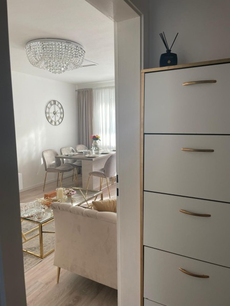 Zu dem Apartment zählen drei schöne Zimmer. Das geräumige Schlafzimmer bietet viel Platz. Das zweite Schlafzimmer kann sowohl als Kinderzimmer als auch Arbeitszimmer genutzt werden. Besonders hervorzuheben ist, dass es nicht nur einen Balkon gibt, sondern Sie auch den Garten des Hauses mitbenutzen können. In der Innenausstattung mit inbegriffen ist eine Einbauküche aus Hochglanz inklusive Elektrogeräte von Siemens. Zur Wohnung gehören außerdem noch ein Keller mit genügend Stauraum und ein Stellplatz zur Miete für Ihr Auto. Dadurch gehört langes Parkplatzsuchen der Geschichte an. Sie können das Objekt provisionsfrei erwerben.