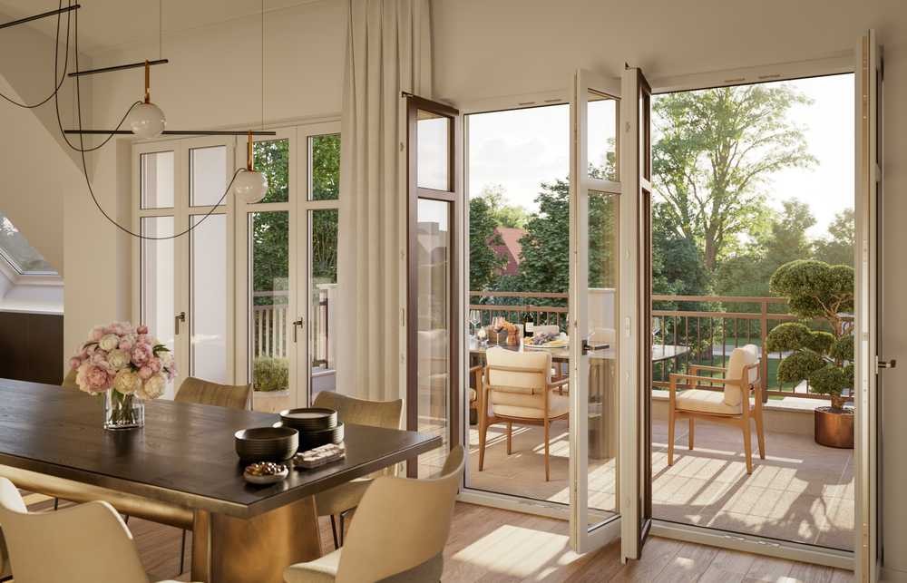 Idyllische, ruhige Privatgärten und großzügige, sonnige Terrassen bieten schöne Sichtachsen und geschützte Freiräume. Raumhöhen über 3 Meter in der Dachgeschoss Ebene sorgen für ein freies Raumgefühl. Die beiden Gartenwohnungen haben jeweils einen direkt verbundenen Souterrain-Bereich mit wohnlichen, hellen Hobbyräumen und hochwertigen Badezimmern – sie erweitern effektiv den nutzbaren Wohnraum zu einem Haus im Haus Konzept für vielfältige Gestaltungsmöglichkeiten, wie zum Beispiel für ein Gym/ Spa oder Arbeits-/ Gästebereiche. Beide Gartenwohnungen zusammen ergeben ein äußerst großzügiges Haus im Haus mit über 308 m² Wohnfläche, bis zu 10 Räumen und einer Garten-/ Freifläche von ca. 635 m². Im Obergeschoss befinden sich zwei Wohneinheiten mit großzügigen und offenen Wohn-/ Essbereichen, attraktiven Grundrissen und sonnigen Terrassen.