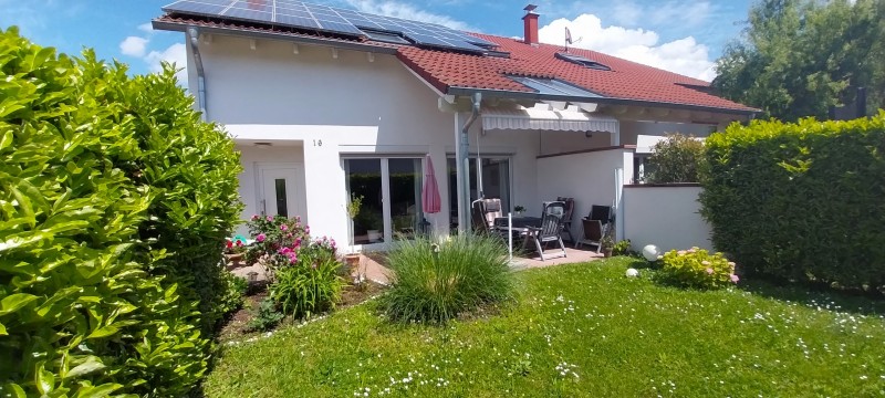 Der vordere Bereich ist nach Süden ausgerichtet, bietet eine überdachte, ca. 15m2 große Terrasse mit Markise und schöner Bepflanzung. Der hintere Teil ist nordwestseitig und bietet im Sommer oft gesuchte, schattigere Plätzchen. Durch die ideale Ausrichtung des Hauses haben Sie den ganzen Tag Sonne und Licht auf dem Grundstück.